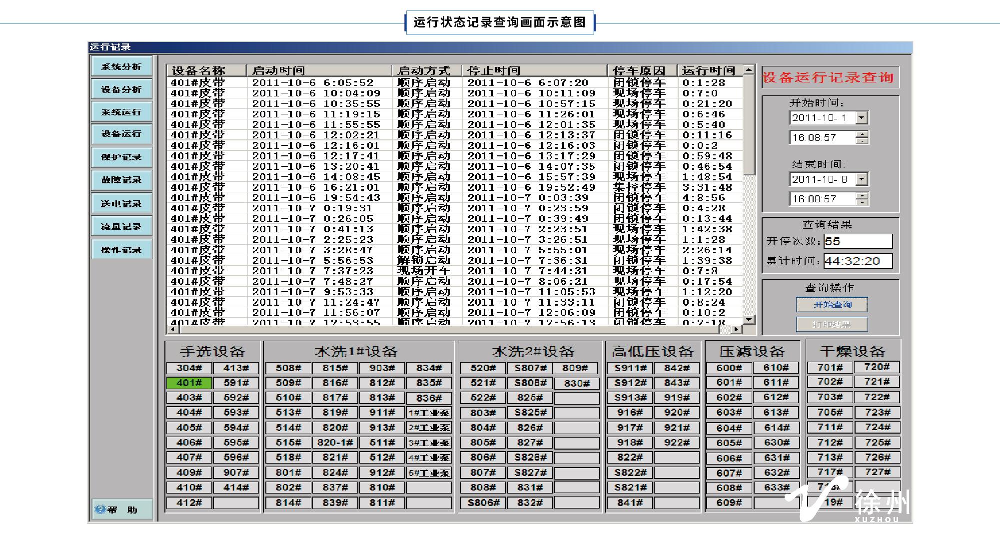 14)設備運行記錄:實時記錄設備的開停狀況,能查詢1年內的設備的開停情況,并自動累計運行時間,開停次數等。記錄內容包括:設備名稱、開車時間、開車方式、停車時間、停車原因、運行時間等。