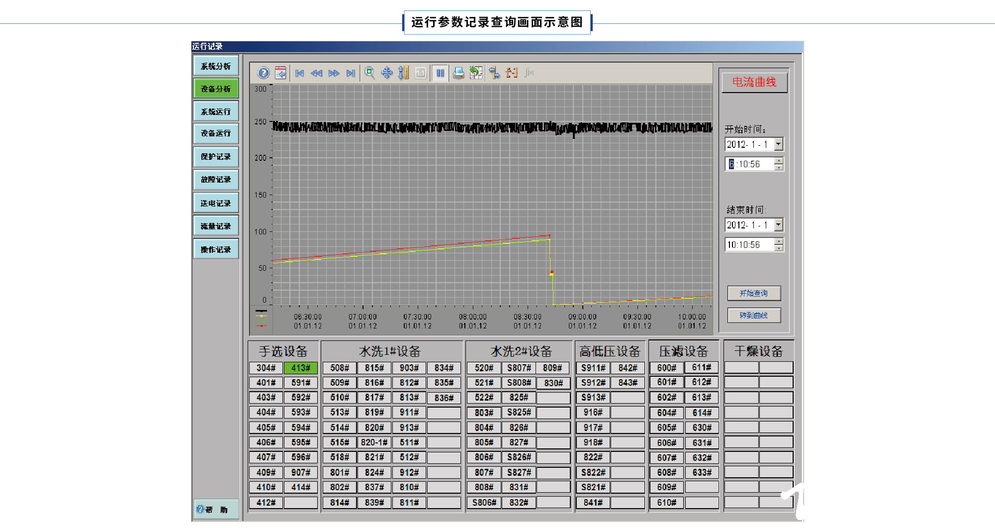 11)設備故障分析:當設備停車時,系統能自動判斷停車原因。主要停車原因如下:電機保護故障停車、皮帶保護故障停車、現場停車、閉鎖停車、掉電停車、集控停車、自動停車、流程停車、系統急停等,其中,電機保護故障能具體到故障原因,皮帶保護故障具體到故障的位置。